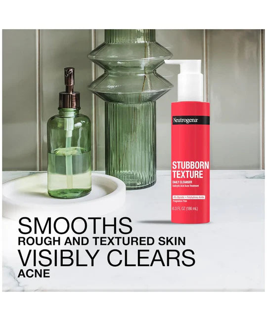 Help clear stubborn acne and visibly smooth uneven skin texture. This oil-free daily face wash contains a dermatologist-grade acid complex including 1% salicylic acid (BHA), 2% glycolic acid (AHA), and 2% polyhydroxy acid (PHA). Neutrogena® Stubborn Texture Acne Facial Cleanser gently exfoliates to clear stubborn acne and shed rough, surface skin cells – leaving skin smooth and soft with visible results in just 1 week.